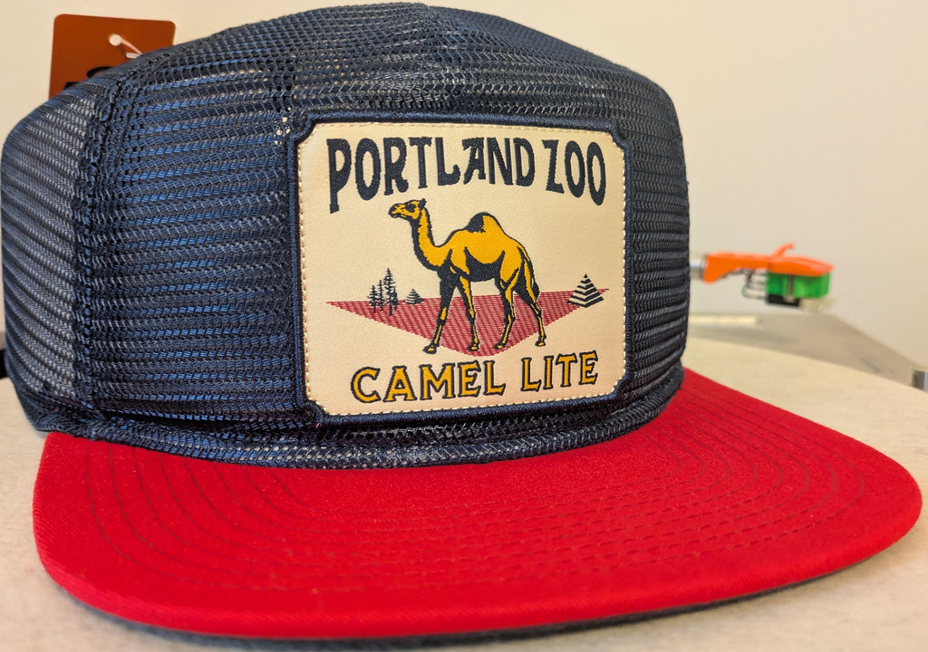 Trucker hat with Portland Zoo Camel Lite Patch with rope